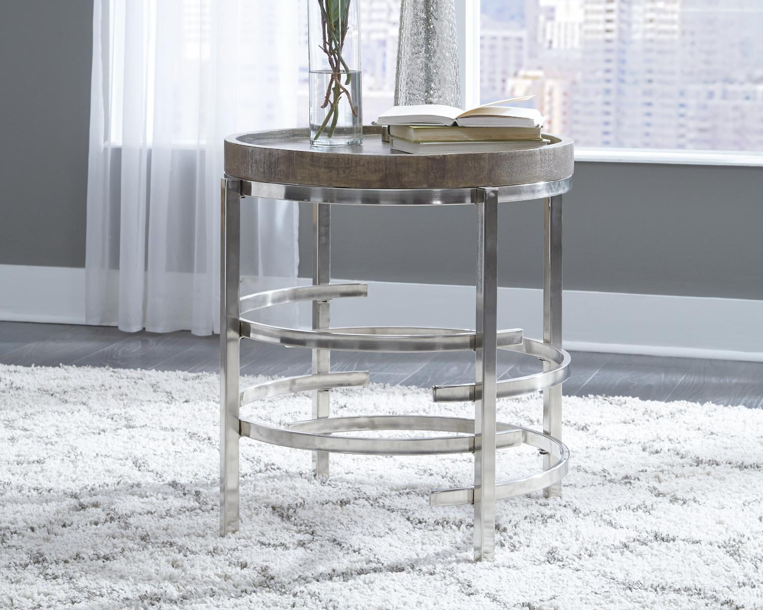 Signature Design By Ashley Zinelli Round End Table With Solid Wood Top And Polished Chrome Base Conlin S Furniture End Tables